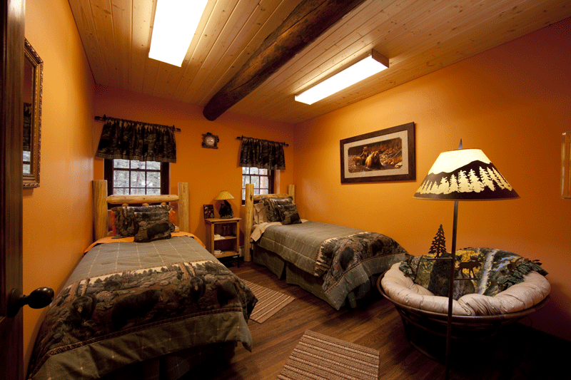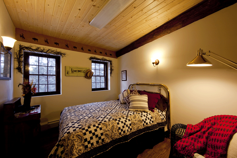 With 2 windows and bright light streaming in, this room is cheery and emanates the ambiance of a gentle autumn day. It has two hand-hewn extra-long log twin beds and adorned with striking images of bears. This room is warm and welcoming and creates that feeling of peace that only Nature can inspire. This is an ideal room for two people that want to share a room but want their own cozy bed; or for one person that wants to spread out.