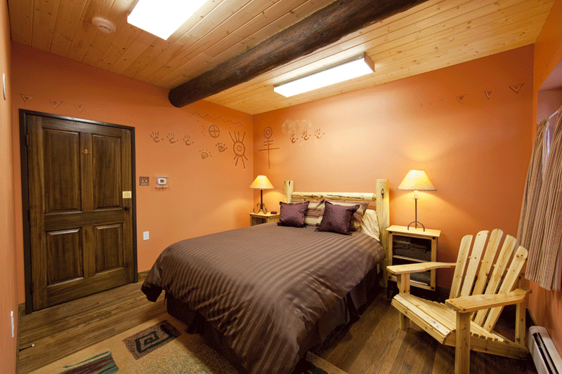 In the mountain park there is a nearby magical canyon that is short walk from the lodge. This room reflects the magic of the canyon colors, has a queen log bed and private bath. Beautiful canyon images of petroglyphs found in another nearby canyon grace the walls.