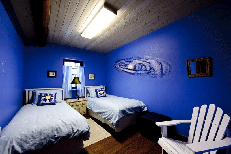 Deep rich blue walls wrap this cozy space while hand painted images of the night sky inspire deep sleep in the 2 twin beds.