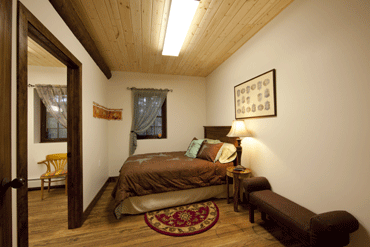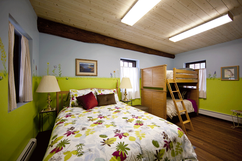 This room’s mellow green walls create that feeling of peace that only Nature can inspire. With a queen over queen bunk, it is homey and most welcoming after a day on the trails.