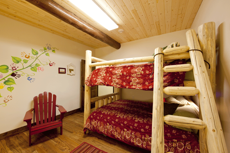 This room has a queen over queen bunk and reflects some of the wild fauna found among the pines outside the walls of the lodge. Simple and uncluttered, this room is a great place to find a restful night’s sleep. has a queen over queen bunk and is washed in luscious white adorned with a colorful Nature mural. It is a perfect room for quiet rest after a day of hiking the park’s trails.