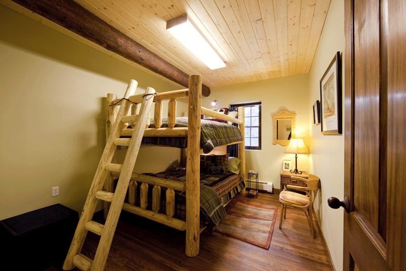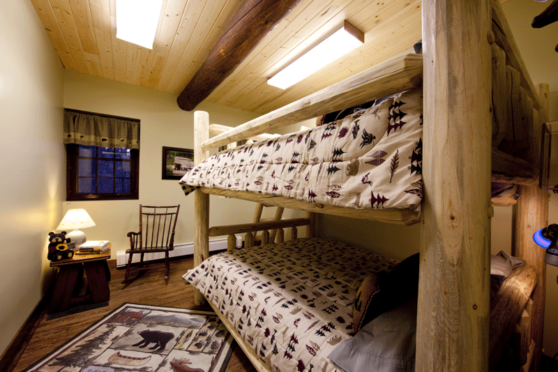 This room has a queen over queen bunk and reflects some of the wild fauna found among the pines outside...